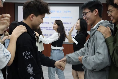 年级辅导员严瑾带领学生开展了以班级建设为主题的团体辅导,活动分为“感谢遇见”、“团队的力量”、“我的相似圈”、“共绘蓝图”、“大学生活拼图”、“相亲相爱一家人”6个环节。在“感谢遇见”环节,学生们互相问候,以花样握手的形式认识新朋友,增进相互间的了解;在“团队的力量”环节,学生们通过“无家可归”和“解开千千结”两个活动,相互协作,攻克难关,充分感受到集体的力量;在“我的相似圈”环节,学生们找寻与自己具有相似特征的同伴,拉近班级成员之间的距离;在“共绘蓝图”环节,学生们分小组接力作画,发挥所长,共同描绘出对大学生活的憧憬;在“大学生活拼图”环节,学生们从课程学习、专业发展、人际关系、身心健康等9个方面规划、思考大学生活,树立明确目标;最后,班级成员手拉手齐唱《相亲相爱一家人》,用歌声表达对集体的热爱。